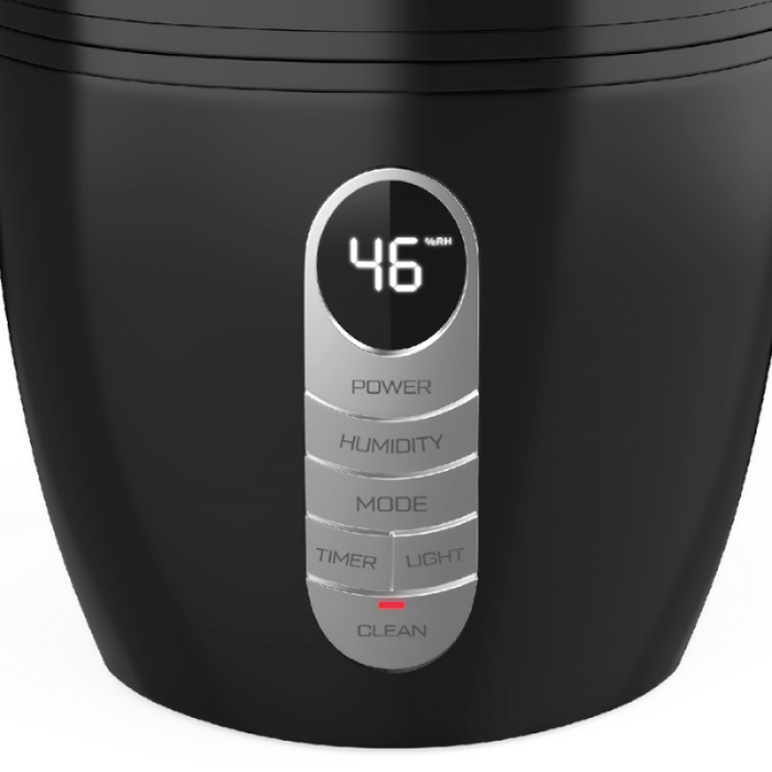 - Электронная панель управления имеет 3 режима скорости выхода пара, таймер, индикация относительной влажности воздуха.